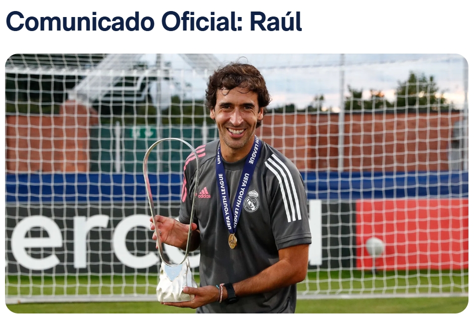 皇家马德里足球俱乐部宣布,劳尔已告知俱乐部决定结束在我们青训队担任教练职务的决定。