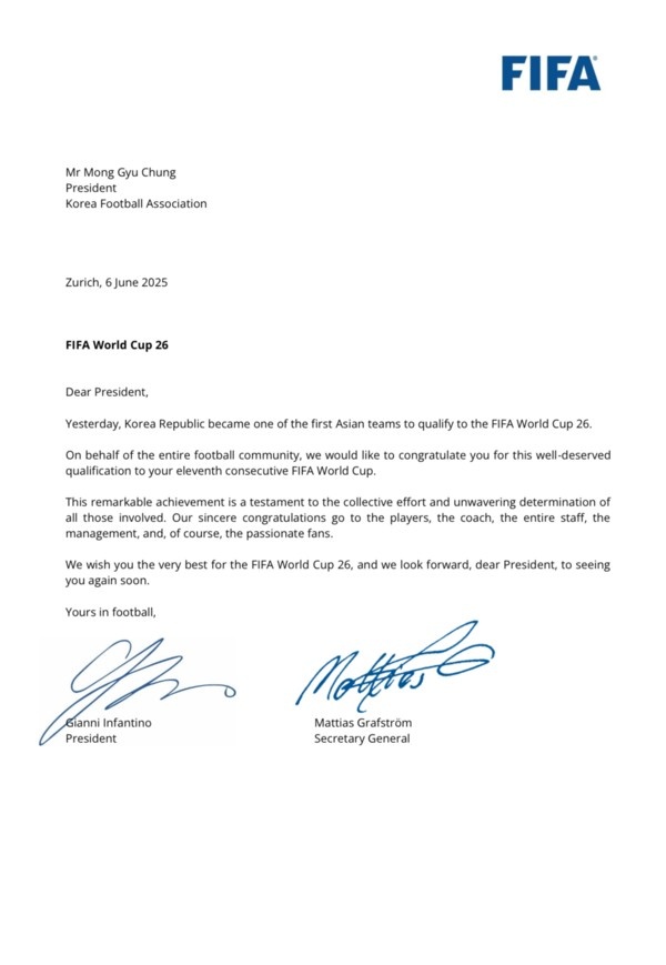 此前他再次通过国际足联的官方信函表达了祝贺,他在贺信中表示:“这一杰出成就是所有相关人员共同努力和坚强意志的体现。我谨向韩国队的球员、包括主教练在内的教练组、支持团队以及所有热情的韩国球迷致以最诚挚的祝贺。”