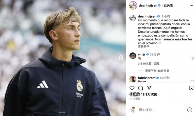 怀森社媒:身披皇马白色战袍的首场正式比赛,何其自豪