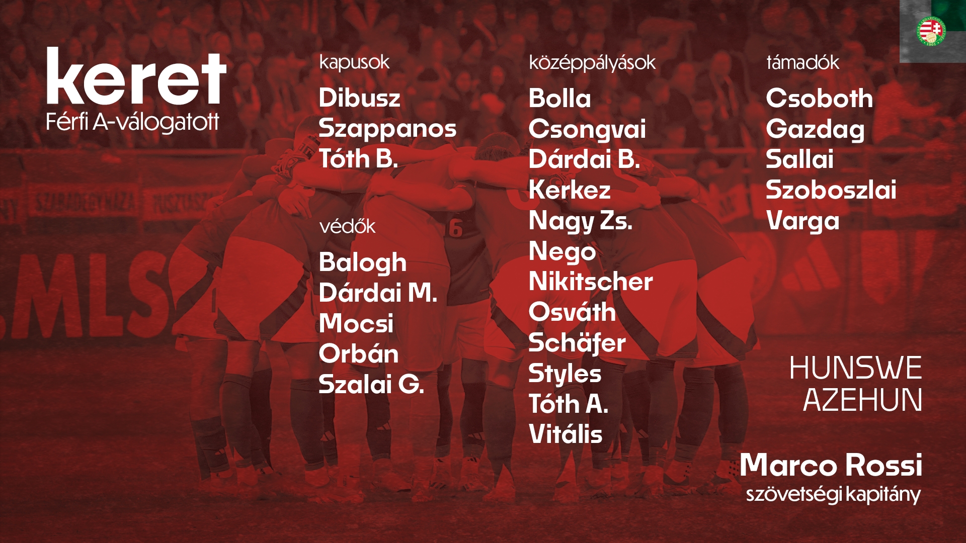 中场:科尔克兹(伯恩茅斯)、本德古兹-博拉(维也纳快速)、阿伦-森格瓦伊(AIK索尔纳)、达尔伊(沃尔夫斯堡)、若尔特-纳吉(普斯卡什学院)、卢瓦克-内戈(勒阿弗尔)、尼基舍(巴拉多利德队)、阿蒂拉-奥斯瓦特(帕克斯)、舍弗尔(柏林联合队)、斯泰尔斯(西布朗)、亚历克斯-托特(费伦茨瓦罗斯)、米兰-维塔利斯( 吉奥利ETO)