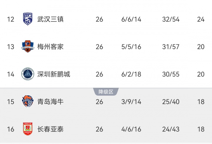 在联赛仅剩4轮的情况下,亚泰与海牛同积18分,而梅州和深圳同积20分。按照规则,赛季结束后中超联赛排名最后两位的球队降入中甲